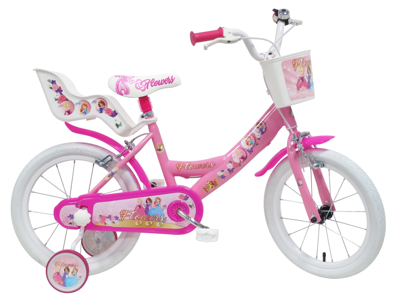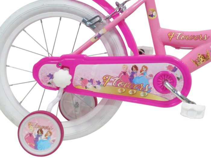 Dit vrolijk gekleurde kinderfietsje is een stevig en veilig product, geschikt voor kinderen vanaf ca 5 jaar. Het stabiele frame, de 16 inch spaakwielen met massieve luchtbandjes, calliperremmen op zowel het voorwiel als het achterwiel, spatbordjes, een bel en afneembare zijwieltjes maken dit leuke model een ideaal fietsje waarmee het kind spelenderwijs leert rijden, sturen en stoppen. De ketting is keurig opgesloten in de kettingkast. In het mandje aan het stuur kan een koekje voor onderweg worden meegenomen, terwijl de pop mee kan in het zitje achterop. Dit fietsje is niet bedoeld om mee deel te nemen in het echte verkeer, er zit bijvoorbeeld geen verlichting op. Maar op eigen terrein, de stoep, het schoolplein en bij voorkeur onder toezicht van een oplettende volwassene kan het kind de beginselen van het fietsen onder de knie krijgen. Voor het kind zullen de lieve kleuren en mooie prinsessenplaatjes het meest aanspreken, terwijl het al rondrijdend de wereld om zich heen ontdekt en vergroot.