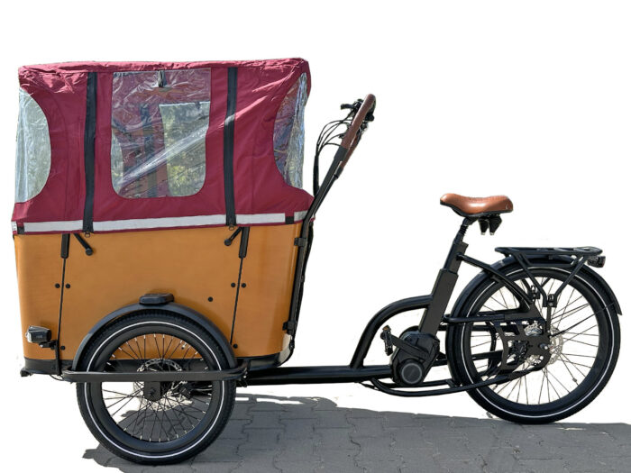 Arkona MC elektrische bakfiets Nexus 8 naaf De kenmerkende ronde hoeken van de fraaie houten bak springen direct in het oog. Deze bakfiets is met liefde door vakmensen gebouwd, dat zie je aan alles. Met behulp van de opstaptredes boven de voorwielen kunnen de passagiers vlot instappen. De bakfiets wordt aangedreven door een Ananda middenmotor met 120 Nm aan trekkracht. De 14 Ah accu is onder het zitbankje in de bak geplaatst, mooi uit het zicht. Via een oplaadaansluiting aan de achterzijde van de bak kan de accu in de fiets worden opgeladen. Maar je kunt de accu ook uit de bak losmaken om deze binnenshuis op te laden. Dat is bij koud weer of als je de bakfiets niet dicht bij een stopcontact kunt stallen een prettige optie. De hardhouten bak kan een gewicht van 120 kilo dragen en biedt ruimte aan 4 kleine kinderen. De bak is gemonteerd op een stevig stalen frame. Aan weerszijden van de bak zitten de 20 inch voorwielen met spatborden en hydraulische schijfremmen met parkeerrem, die via een drukknop op de remhendels is te activeren. Het achterframe van deze bakfiets is van aluminium. Het 26 inch achterwiel is voorzien van een soepel schakelende Shimano Nexus 8 versnellingsnaaf en een hydraulische schijfrem. De berijder en eventuele bagage die op de bagagedrager wordt meegenomen mogen in totaal 100 kilo wegen. De totale maximale belasting komt hiermee uit op 220 kilo. De Ananda middenmotor werkt op 48 Volt, die wordt geleverd door de 14 Ah accu, met een totale capaciteit van 672 Wh. Hiermee is de actieradius van de fiets, afhankelijk van de omstandigheden, tussen de 50 en 75 kilometer. Ruim voldoende voor de meeste ritten die u met een bakfiets zult maken. Zeer compleet geleverd Deze bakfiets wordt geleverd inclusief een huif die beschermt tegen zon, kou en regen, twee zitkussentjes voor de bankjes en vier verstelbare veiligheidsgordels. Op deze manier kunt u tot 4 kinderen veilig en droog meenemen. Op het LCD display leest u snelheid en afstand af en kunt u de gewenste trapondersteuning kiezen. De Walk Assist functie en de verlichting zijn ook via het display te activeren. De verlichting werkt op de accu en voldoet aan de eisen van de StVZO, de Duitse verkeerswet. U kunt ervan op aan dat u goed zichtbaar bent voor andere weggebruikers. Het achterlicht is voorzien van een remlicht functie. De bakfiets is tevens voorzien van richtingaanwijzer lampjes. De Arkona MC is 90 cm breed en 227 cm lang. De bak is 58 cm breed, 106 cm lang en tussen de 46 en 58 cm hoog. Het totaalgewicht van de bakfiets is 76 kilo.