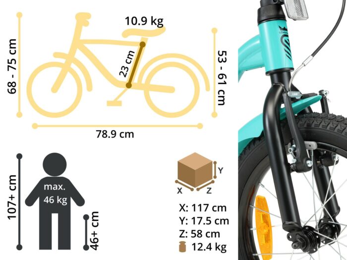 **De Löwenrad kinderfietsen hebben een stoere uitstraling. **De fietsjes zijn geschikt voor meisjes en jongens, waarbij de kleur de doorslag zal geven welke fiets het kind het liefst zou willen hebben. Dit Löwenrad fietsje is waarschijnlijk het eerste echte fietsje dat uw (klein-)kind zal krijgen. Dat is een grote stap in het jonge leventje! De fiets geeft het kind de mogelijkheid om de wereld te ontdekken, zelfstandig naar vriendjes of vriendinnetjes te rijden en een groot aantal nieuwe ervaringen op te doen. Je wilt natuurlijk dat het fietsje veilig is, goed in elkaar is gezet en jarenlang mee kan gaan. De fietsen van Löwenrad voldoen aan alle eisen. Houd er wel rekening mee dat de fietsen niet bedoeld zijn om het kind zelfstandig aan het echte verkeer te laten deelnemen. Ze zijn echter prima geschikt om samen met een volwassen begeleider een fietstochtje te maken. Op afgesloten terrein of een relatief veilige omgeving als de stoep in een rustige woonwijk kunt u het kind wat meer vrijheid gunnen, zodat het leert omgaan met snelheid, onverwachte situaties, vallen en opstaan. De fietsjes kunnen er tegen. **Kenmerken van dit model:** Leeftijd: vanaf ca. 4 jaar (105 cm lengte) zadelhoogte: ca. 53-61 cm stuurhoogte: ca. 68-75 cm gewicht: 10.9 KGStevig stalen frame met slagvaste laklaag, Stuur met kogellagers, in hoogte en hellingshoek instelbaar. Ergonomisch gevormd kinderzadel, in hoogte en hellingshoek instelbaar Gecertificeerde, gifvrije veiligheidshandgrepen Voorwielrem met op kinderhandjes aangepaste, instelbare greep. Terugtraprem. Volledig gesloten kettingkast en trapas met kogellagers Reflectoren aan voor- en achterzijde en aan de pedalen 16 inch luchtbanden op hoogwaardige aluminium velgen 95%25 voorgemonteerd, in circa 15 minuten af te monteren