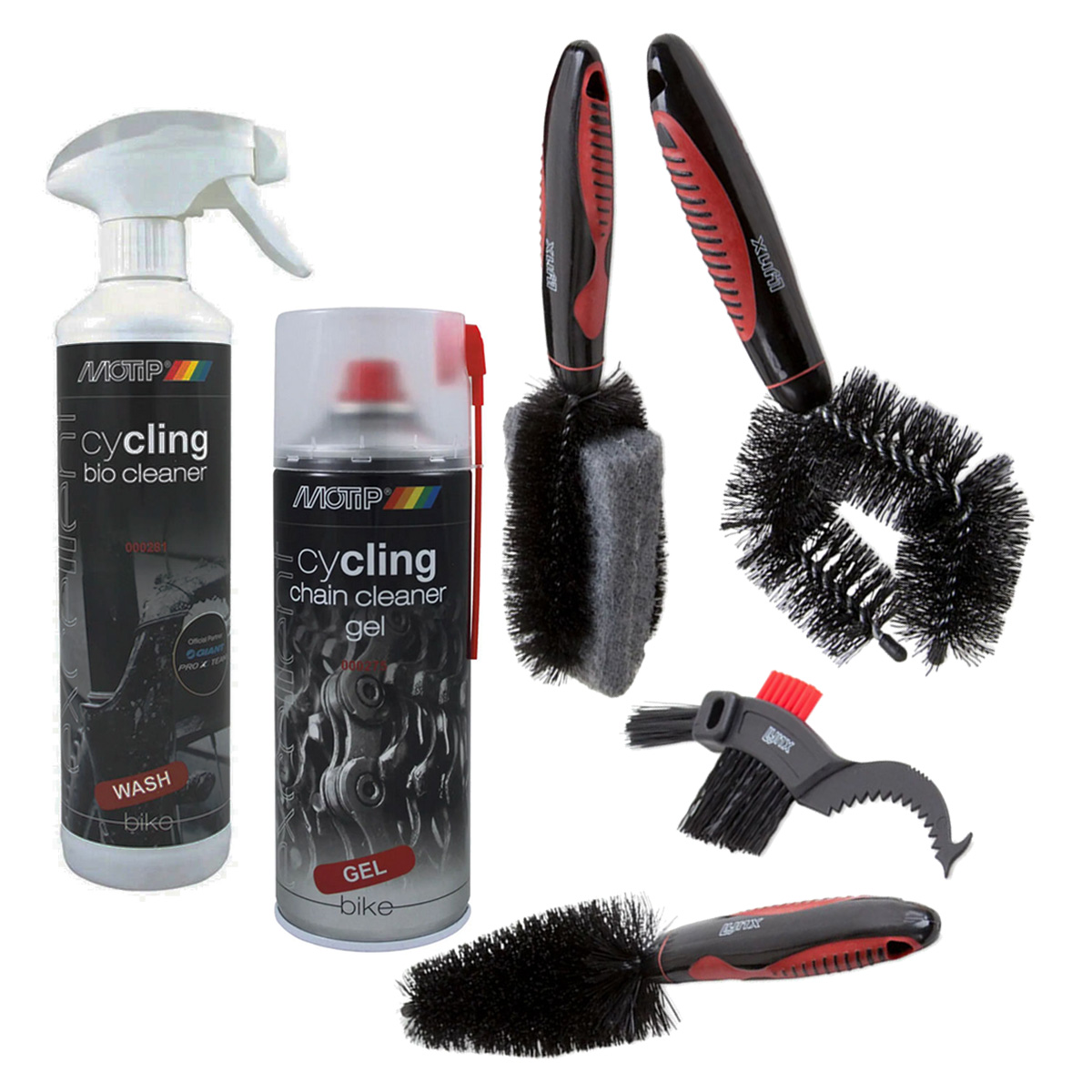 Bespaar op aanschaf- en verzendkosten met dit Valuepack. Een goed onderhouden fiets rijdt fijner, ziet er beter uit en zal het langer uithouden. Motip Cycling kettingreiniger gel is een hoogwaardige reiniger voor kettingen en tandwielen. Chain Cleaner Gel heeft door zijn unieke receptuur een optimaal reinigende werking en is uitermate geschikt voor het verwijderen van vet en vuil. Met een krachtige sproeistraal en een 360° ventiel. Motip Cycling Bio Cleaner is een biologisch afbreekbare reiniger met een hoog oplossend vermogen die op de gehele fiets aangebracht kan worden. Bio Cleaner laat hierbij een subtiele geur achter. De reiniger is vriendelijk in gebruik en erg effectief, gemaakt op waterbasis. 500 ml. Met deze complete 4-delige borstelset is je fiets in een handomdraai schoon. Deze set bevat ieder type borstel, welke nodig is om de gehele fiets te reinigen. De borstels worden geleverd in een handig draagtasje en bevat: – Banden- en frameborstel – Wiel- en onderdelenborstel – Schuurspons/borstel – Aandrijflijn borstel