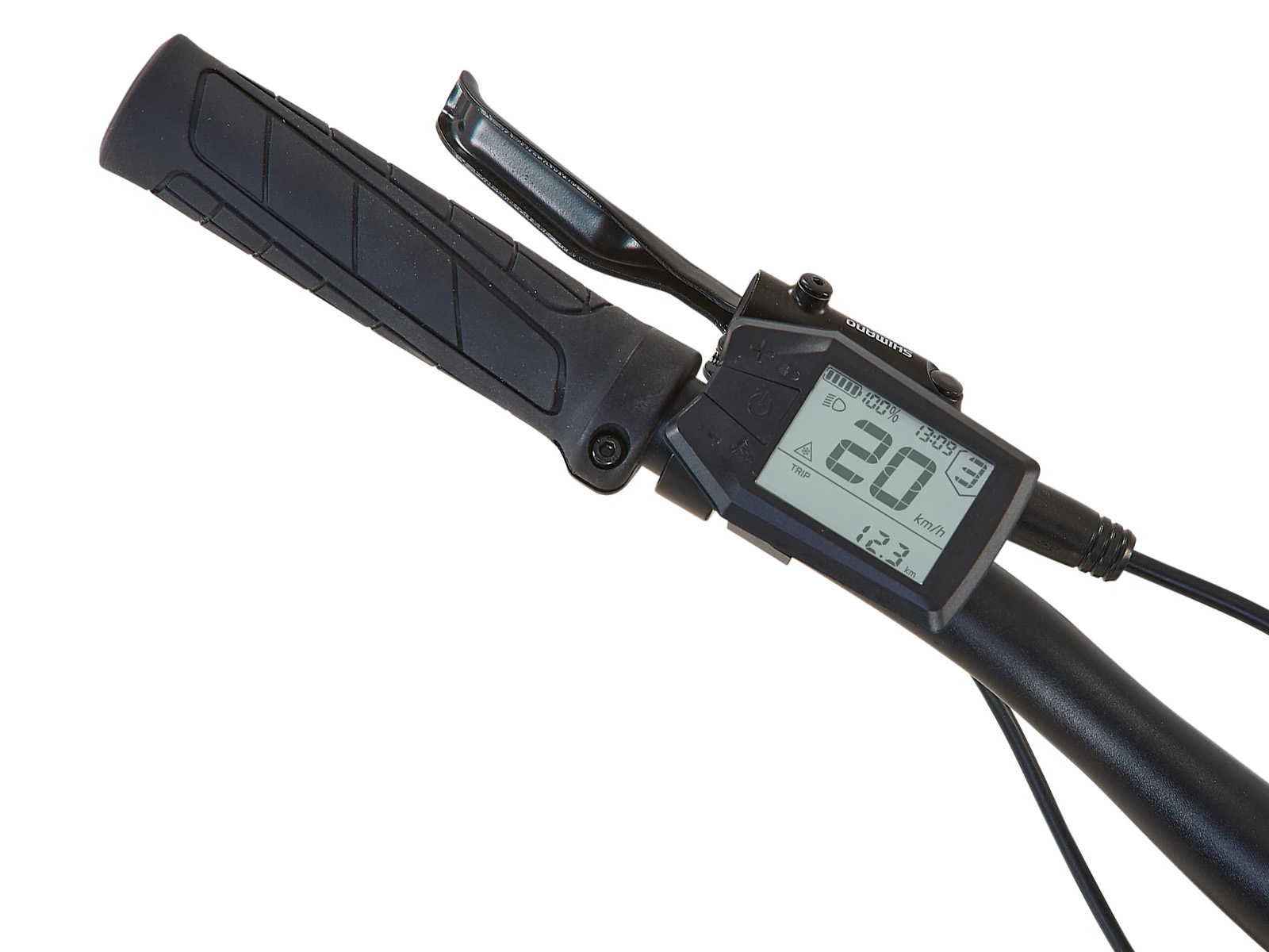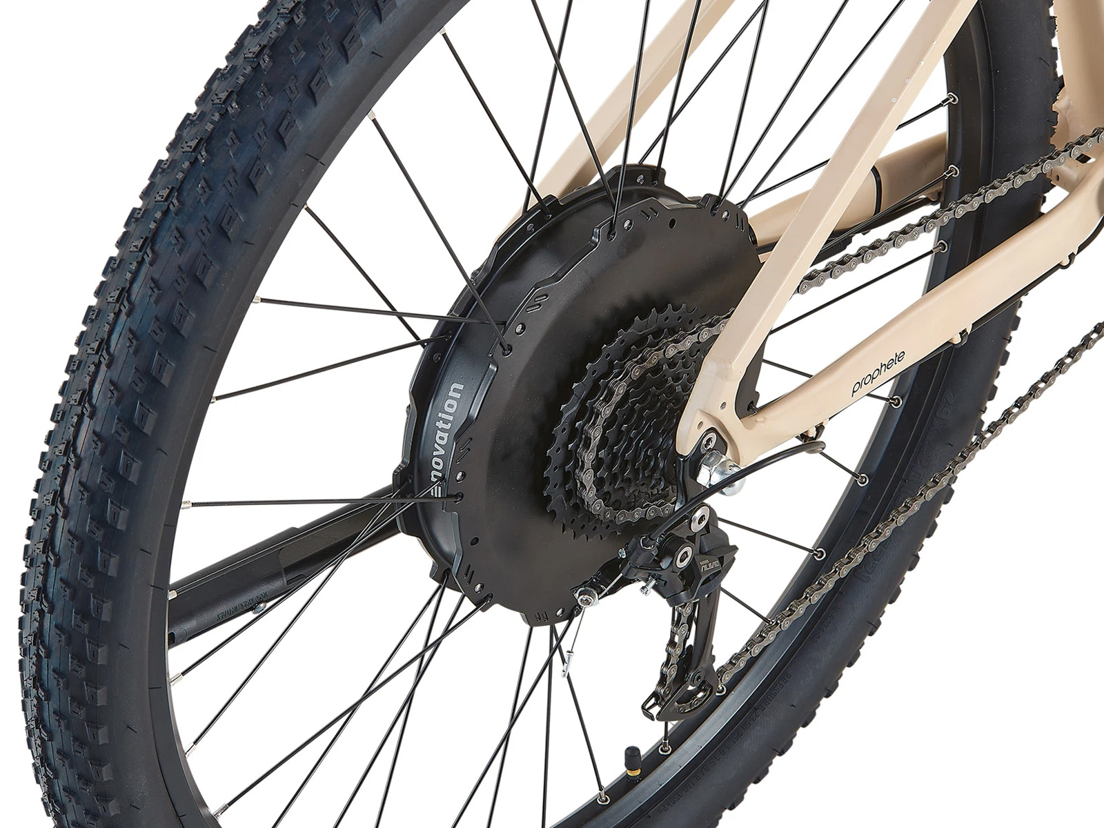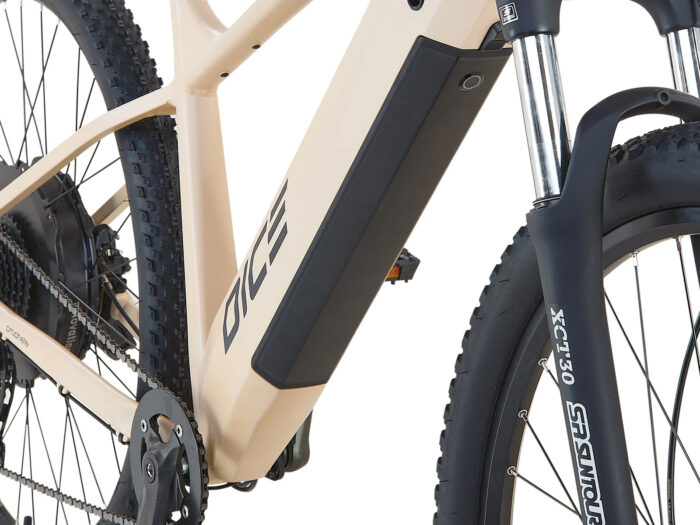 Onder de e-MTB’s in het Prophete-assortiment is de Prophete Dice 2.0 een echte allrounder. Met zijn 29“-banden en een framehoogte van 48 cm is de ”Twentyniner” hardtail een soepel rijdend model, zelfs op oneffen terrein. Hij heeft een krachtige 48 volt enovation-achterwielmotor, die 250 watt vermogen levert bij een maximaal koppel van 46 Nm. Tijdens het rijden voelt het bijna alsof je wordt geduwd wanneer je je door de motor laat ondersteunen. Dankzij de volledig in het frame geïntegreerde 10 Ah (480 Wh) lithium-ion-accu haalt je nieuwe e-bike een actieradius tot 130 km, afhankelijk van je rijstijl en het terrein. Er is ook een handige duwhulp voor steile hellingen ingebouwd, zodat je de e-MTB ook lopend de berg op kunt duwen. Zo spaar je je eigen energie en is de volgende afdaling dubbel zo leuk. Op het multifunctionele LCD-display zie je de actuele informatie over de Dice e-bike. Het ondersteuningsniveau van de motor, het accuniveau en de snelheid zijn slechts de belangrijkste details. Met de bedieningseenheid van het display bedien je ook de duwhulp. Af fabriek is er geen verlichting in de e-MTB geïntegreerd maar die kun je zelf toevoegen. Uiteraard is de Dice 2.0 ook uitgerust met het CAN-busprotocol, zodat de elektronische onderdelen één geheel vormen en met elkaar communiceren voor nauwkeurigere evaluatieresultaten. Voor remmen en versnellingen kun je volledig vertrouwen op Shimano. Hydraulische schijfremmen en een 9-speed Alivio-derailleur maken je klaar voor vrijwel elke situatie in het terrein. Je kunt gewoon gaan rijden en ontdekken wat deze hardtail in huis heeft. De Suntour XCT-verende voorvork vangt op oneffen terrein de hardste schokken op. Met een veerweg van 100 mm worden je polsen en onderarmen ontzien. Omdat het achterwiel niet geveerd is, heb je een betere krachtoverbrenging tijdens het trappen en over het algemeen een betere stijfheid in het frame, wat merkbaar energie bespaart als de offroad-tocht weer eens langer duurt dan gepland. De bijbehorende oplader voor de accu en een handleiding worden meegeleverd.