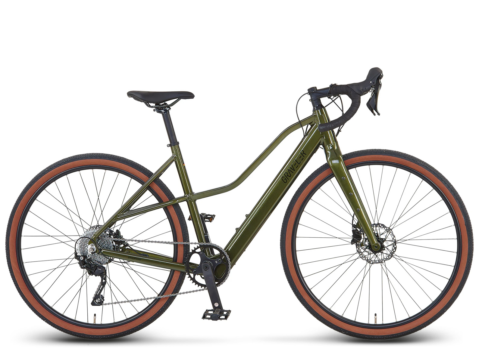 De Prophete Graveler 1.0 is een gravel-e-bike die het gat tussen racefietsen en trekking-e-bikes opvult. Met zijn trapeziumframe van 48 cm hoog en de Prophete Race Bar als stuur is al snel duidelijk welke kant het opgaat. Snelle afdalingen op geasfalteerde wegen zijn net zo goed mogelijk voor de Graveler e-bike als snelle tochten op grind. Dit Prophete model in glanzend metallic groen met Kenda-banden blijft zelfs op ruw terrein soepel en stabiel in het spoor. De gewikkelde handvatten op het gebogen racefietsstuur bieden de perfecte grip voor alle handposities. De gecombineerde Shimano GRX rem-/versnellingshendels zijn makkelijk te bereiken en de hydraulische schijfremmen en de Shimano GRX 10-speed derailleur kunnen met een kleine handbeweging worden bediend. Op het stuur zit ook het TFT-multifunctionele kleurendisplay met een duidelijk statusrapport over het e-bikesysteem, waarvan de elektronische onderdelen natuurlijk met elkaar communiceren via het CAN-busprotocol. De 36 volt achterwielmotor met vrijloop en koppelsensor in het trapas biedt een maximaal koppel van 40 Nm en een vermogen van 250 watt. De 10 Ah lithium-ionaccu (360 Wh) is helemaal in de onderbuis geïntegreerd en zorgt voor een actieradius tot 110 km, afhankelijk van je rijstijl en het wegdek. Het leuke aan een e-gravelbike is dat je de trapondersteuning makkelijk kunt gebruiken om de toegestane 25 km/u te halen en vanaf dat moment accuvermogen kunt besparen als je toch al harder gaat rijden. Voor je eigen veiligheid raden we je aan een fietshelm te dragen.