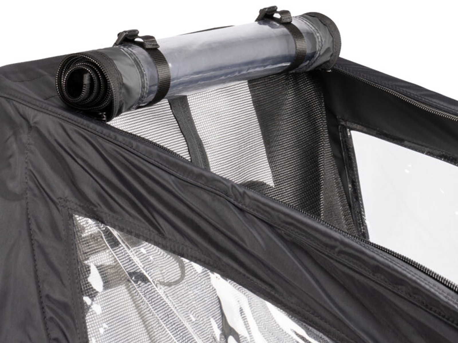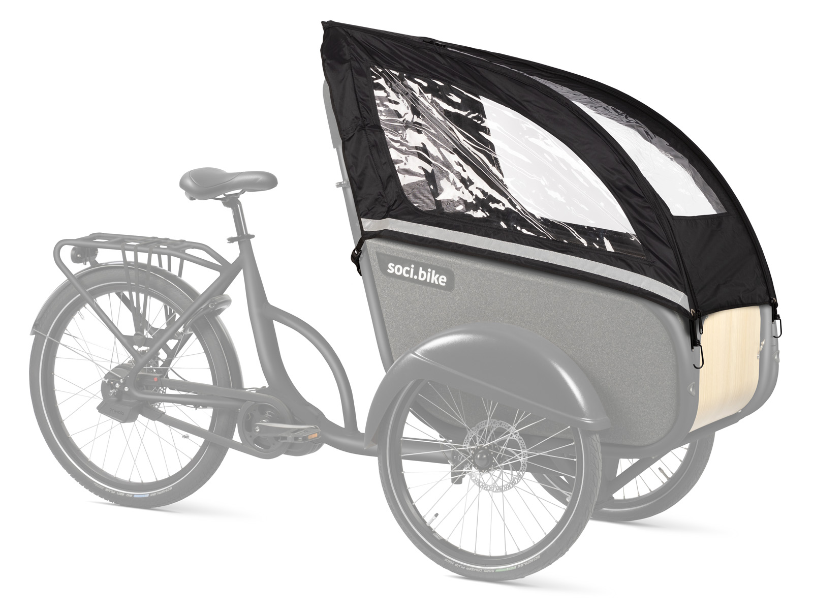 **In Nederland en België is het natuurlijk niet altijd mooi weer.** Met de SociBike huif kun je je kinderen, dieren en boodschappen beschermen tegen regen en wind. De luifel van de SociBike huif is makkelijk los te ritsen en op te rollen. Dankzij de doorzichtige voor-, zij- en achterkant zitten kinderen en dieren niet opgesloten, maar kunnen zij nog steeds alles zien. En dit geldt natuurlijk ook voor jou; jij kunt ook zien wat er in de bak gebeurt. De SociBike huif is een accessoire waar je veel plezier aan hebt. De SociBike huif is, net als SociBike bakfiets, ** gemaakt van hoogwaardige materialen** . De huif is eenvoudig te monteren en demonteren. Aan de voor-/bovenkant zit een rits die eenvoudig open gaat om de bak te kunnen vullen. Het klepje kan gewoon geopend worden. De huif heeft reflecterende strips aan de zijkanten voor extra zichtbaarheid. De voor-, zij- en achterkant is gemaakt van doorzichtige stof.