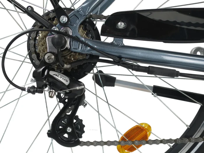 Een elektrische damesfiets met lage instap, achterwielmotor, 7 versnellingen en 28 inch wielen, dat is de Scrapper. Dankzij de achterwielmotor, die op een natuurlijke manier ondersteunt, rijdt deze fiets heel fijn. Waar de ketting het wiel in beweging brengt geeft de motor dat extra duwtje in de rug. U heeft keus uit 7 versnellingen dankzij de Shimano Altus derailleur en uit 5 standen van trapondersteuning. Die kiest u eenvoudig met het LCD display op het stuur. Deze comfortabele fiets is, door de lange zadelpen en het verstelbare stuur, geschikt voor personen van 160 tot wel 185 cm. De 13 Ah accu op de bagagedrager zorgt ervoor dat u onder gunstige omstandigheden tot 120 kilometer kunt fietsen. In de praktijk zal dat minder zijn, maar een rijbereik van 80 kilometer is zeker mogelijk. Specificaties in het kort: MXUS achterwielmotor 250 W, 36 V 13 Ah, 36V, 468 Wh accu, uitneembaar Shimano Altus 7 versnellingen derailleur LCD display, 5 ondersteuningsstanden Aluminium frame 48 cm 28 inch dubbelwandige velgen V-brakes voor en achter Zijstandaard Kunststof kettingscherm.