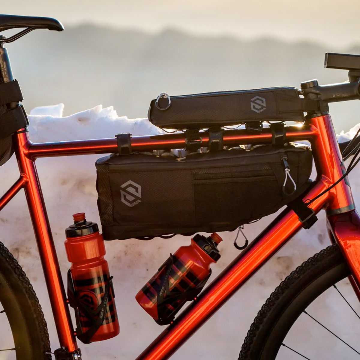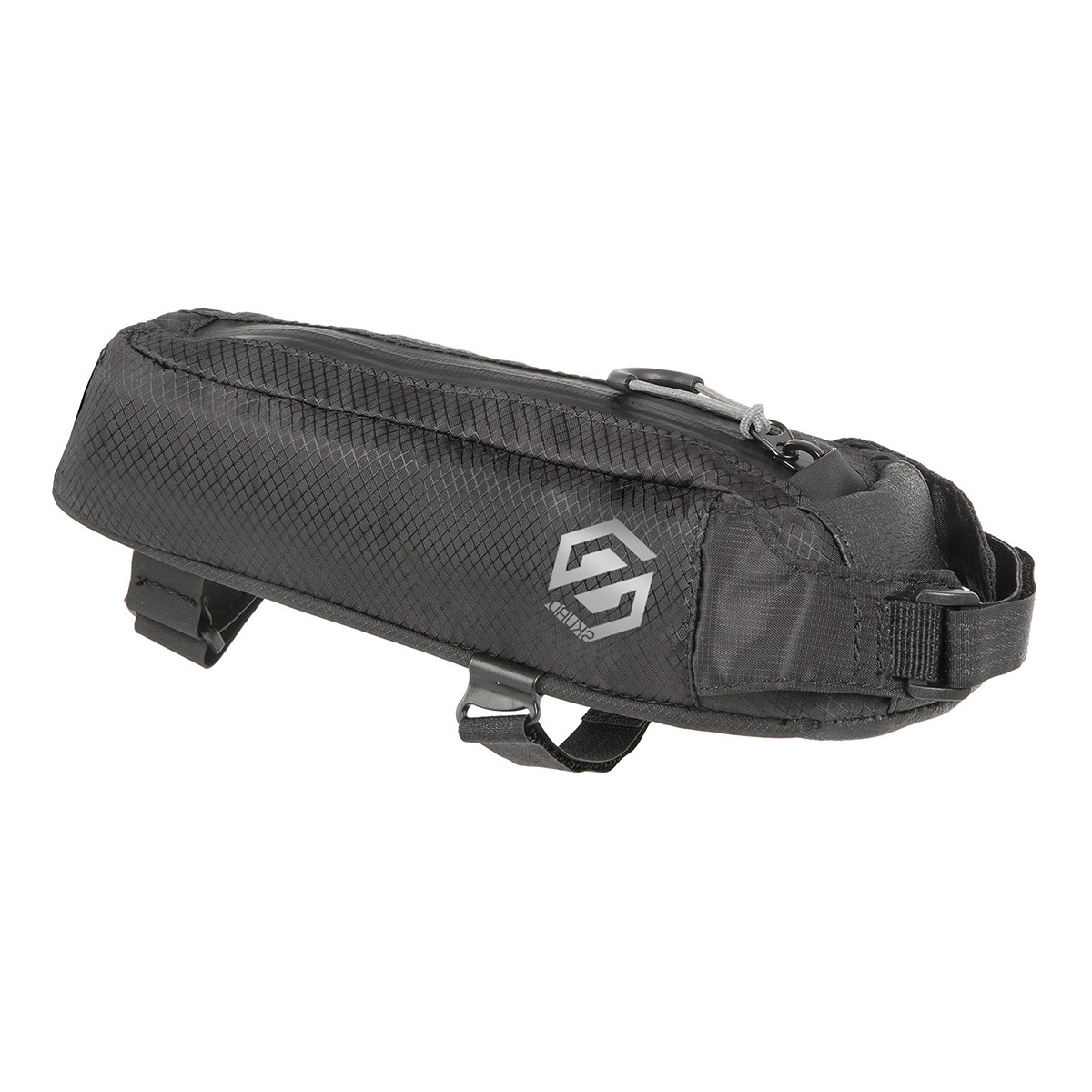Bovenbuistasje van 210D scheurvast polyester 420D waterdicht TPU . Klittenbandriemen voor bevestiging op de bovenbuis. -Afmetingen 29 x 7 x 8,5 cm; inhoud 0,75 liter.