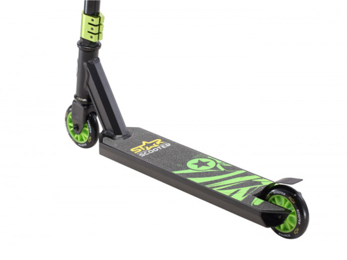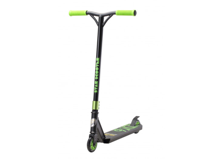 ** Star Scooter, sportieve stepjes voor jong en oud** Naast autopeds maakt Star Scooter ook zeer degelijke, maar lichtgewicht, (soms vouwbare) steps in diverse formaten en uitvoeringen. Modellen waarmee je voor je lol wat kunt rondrijden, maar ook mee naar school kunt steppen op de stoep (kies hiervoor bij voorkeur de typen met de grotere wielen, voor extra rijcomfort). Wil je stunten met je step, kies dan juist voor de smalle modellen met de kleine wielen. De meeste typen zijn er in diverse prijsklassen en kwaliteiten. Ze voldoen alle aan de basisvereisten. Het is aan jou om het beste model voor je doel te kiezen. En daarna de favoriete kleur. Star Scooter heeft veel te bieden, dus het zal lastig kiezen zijn, maar we hebben vast precies wat je zoekt! **De kenmerken van dit model:** – Leeftijd: vanaf ca. 7 – 8 jaar (ca. 125cm lengte) – Lengte: 63cm – Voetbord: 48cm x 10cm – Stuurhoogte: 84 cm – Stuurbreedte: 52 cm – Gewicht: 3,1 Kg – Max draaggewicht 100 Kg – Geschroefde Super Industry Headset – Versterkte stalen vork – Superlicht Concaves Deck met Grind Rails – Versterkte 3 mm aluminium Butterfly Neck – Antislip Grip Tape – Stabiele achterwielrem van CrMo staal – 100mm High Rebound banden op aluminiumvelgen – Ultralichtlopende ABEC 7 chroom kogellagers – Stuur van 6061 T6 vliegtuig-aluminium met 2° Backsweep – 95%25 voorgemonteerd