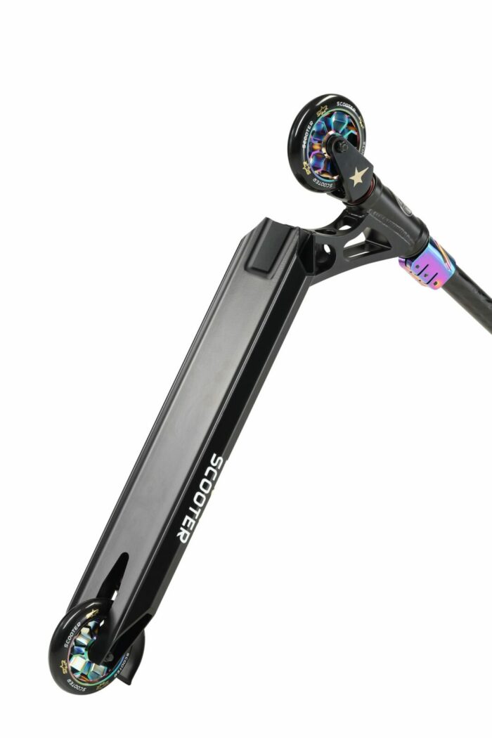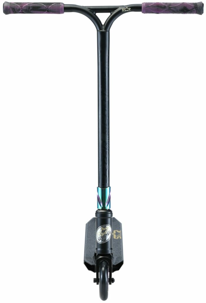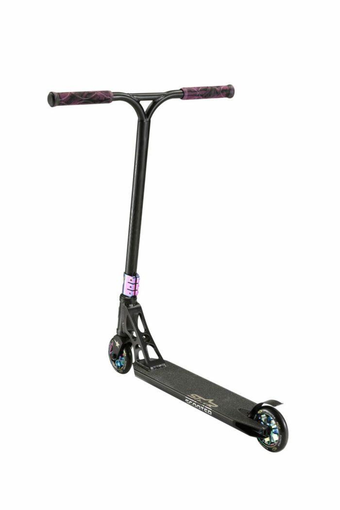 ** Star Scooter, sportieve stepjes voor jong en oud** Naast autopeds maakt Star Scooter ook zeer degelijke, maar lichtgewicht, (soms vouwbare) steps in diverse formaten en uitvoeringen. Modellen waarmee je voor je lol wat kunt rondrijden, maar ook mee naar school kunt steppen op de stoep (kies hiervoor bij voorkeur de typen met de grotere wielen, voor extra rijcomfort). Wil je stunten met je step, kies dan juist voor de smalle modellen met de kleine wielen. De meeste typen zijn er in diverse prijsklassen en kwaliteiten. Ze voldoen alle aan de basisvereisten. Het is aan jou om het beste model voor je doel te kiezen. En daarna de favoriete kleur. Star Scooter heeft veel te bieden, dus het zal lastig kiezen zijn, maar we hebben vast precies wat je zoekt! **De kenmerken van dit model:** – Leeftijd: vanaf ca. 8 jaar (ca. 130cm lengte) – Lengte: 71cm – Voetbord: 52cm x 12 cm – Stuurhoogte: 85 cm – Stuurbreedte: 55 cm – Gewicht: 3,4 Kg – Volledig geïntegreerde Headset met HIC compressie – Superlicht Concaves Deck met Grind Rails – Antislip Grip Tape – Stabiele achterwielrem van CrMo staal – 110mm High Rebound banden op aluminiumvelgen – Ultralichtlopende ABEC 9 chroom kogellagers – Stuur van 6061 T6 vliegtuig-aluminium met 2° Backsweep – 95%25 voorgemonteerd