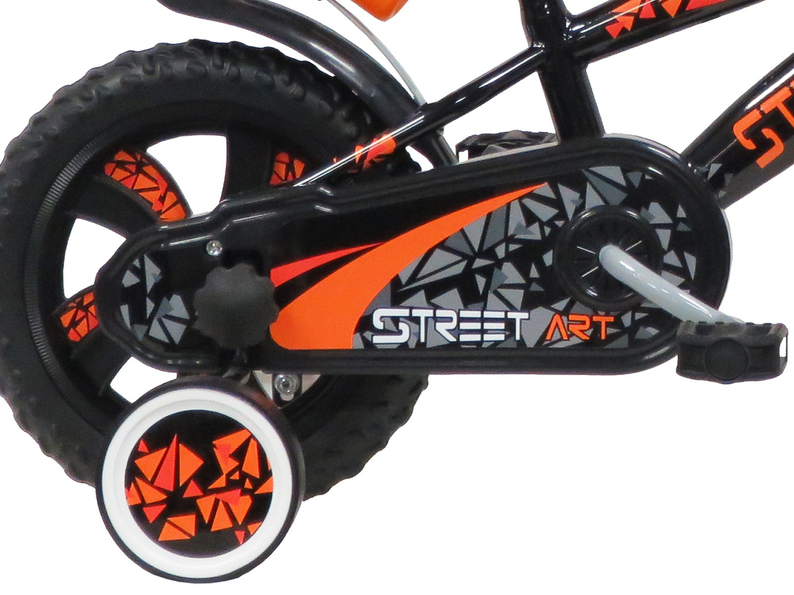 TWEEDE KANSJES EN REFURBISHED ARTIKELEN WORDEN NIET VERZONDEN. U KUNT DE PRODUCTEN VAN MAANDAG TOT EN MET VRIJDAG OPHALEN IN DE SHOWROOM IN DEVENTER, VAN 9.00 tot 17.00 uur. Retour in doos, geweigerd aan de deur Dit stoere kinderfietsje , de Street Art 12 inch zwart met oranje accenten, is een stevig en veilig product, geschikt voor kinderen vanaf ca 3 jaar. Het stabiele frame, de 12 inch kunststof spaakwielen met massieve EVA bandjes, calliperrem op het voorwiel, spatbordjes, een toeter en afneembare zijwieltjes maken dit leuke model een fietsje waarmee het kind spelenderwijs leert rijden, sturen en stoppen. De ketting is keurig opgesloten in de kettingkast. Een beetje ranja in de bidon boven het achterwiel en het avontuur kan beginnen. Op het stuur is een schuimrubber rol bevestigd, ter bescherming van het hoofdje bij ongelukjes. Dit fietsje is niet bedoeld om mee deel te nemen in het echte verkeer, er zit bijvoorbeeld geen verlichting op. Maar op eigen terrein, de stoep, het schoolplein of onder toezicht van een oplettende volwassene kan het kind de beginselen van het fietsen onder de knie krijgen. Voor het kind zullen de stoere kleuren het meeste aanspreken, terwijl het al rondrijdend de wereld om zich heen ontdekt en vergroot.