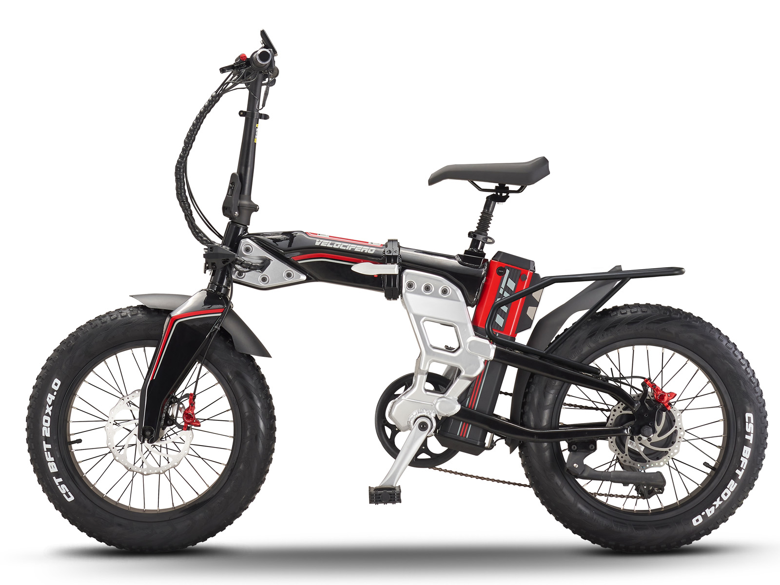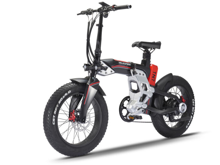 **De Velocifero TNT is een fat folding bike voor wie durft.** Wie een elektrische vouwfiets zoekt om een beetje onopvallend door het leven te fietsen kan beter even verder zoeken. Met deze oogverblindend vormgegeven design vouwfiets spring je altijd in het oog! Het aluminium zwartgelakte frame is voorzien van rode striping, een 48 Volt 624 Wh accu uin vlammend rood en opvallende aluminiumkleurige onderdelen. Het sharp edge design van frame en voorvork, de dubbele LED koplampen, de rode remklauwen, alles werkt mee om van deze vouwfiets eerder een statement dan een vervoersmiddel te maken. Tel daarbij op de 20 inch spaakwielen met 4 inch brede luchtbanden, de geveerde zadelpen en de sportieve, korte spatborden en je hebt een beest van een fatbike tot je beschikking. De 250 Watt achterwielmotor levert 80 Nm trekkracht, waarmee je tot 25 km per uur met ondersteuning kunt fietsen. Het totaal gewicht van berijder en bepakking mag 100 kilo zijn, en de actieradius bedraagt ongeveer 50 kilometer. **Wel opvouwbaar, niet compact** De Velocifero TNT is een vouwfiets met een totaalgewicht van 28 kilo. Het aluminium frame is eenvoudig dubbel te klappen, het stuur vouwt naar de zijkant, maar mede vanwege de 20 inch wielen met dikke banden wordt het geen compact en draagbaar pakket. Deze vouwfiets is dan ook niet bedoelt als handige reisfiets voor forensen en kampeerders. **Stadsfiets met karakter** De Velocifero TNT is met zijn uitgesproken design en flitsende kleurstelling een fiets waarmee je je kunt onderscheiden van de massa. Je rijdt er daarnaast ook heel comfortabel mee door de stad: klinkertjes, tramrails, sneeuw of zand zijn geen partij voor de brede banden. Het zadel is op een geveerde zadelpen gemonteerd voor een extra soepele rijervaring. Op deze scherp sturende fatbike rijd je ook in druk verkeer vlot door de stad, waardoor je er veelal sneller op je bestemming aankomt dan met de auto, dichterbij je einddoel dan met het OV en zonder je blauw te betalen aan de parkeermeters. **Het avontuur lonkt** In je vrije tijd kun je je heerlijk uitleven op de Velicefero TNT. Rij ermee naar club of café, flaneer langs de terrassen of scheur een stuk over het strand. Deze e-bike brengt je stijvol en moeiteloos waar je zijn wilt.