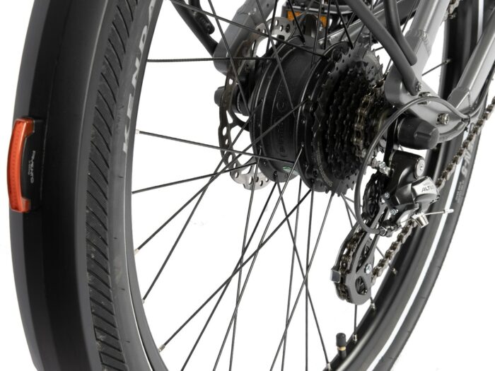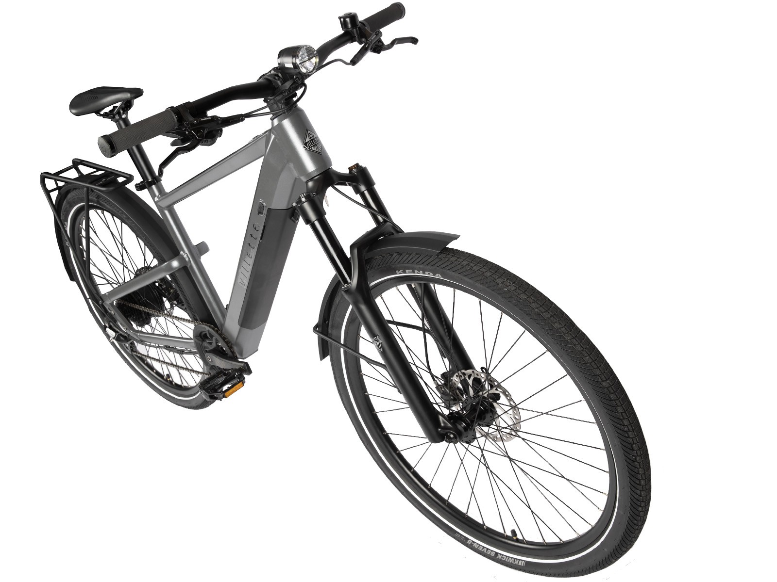 ** De Villette Aventure is een sportieve e-bike met een hoge wauw-factor. Een opvallende design en top specificaties voor de veeleisende gebruiker ** Deze e-bike is het fiets-equivalent van een SUV: een stoere, op een mountainbike gebaseerde e-bike met het comfort van een stadsfiets. Het stevige, fraai gevormde aluminium frame met geïntegreerde 13 Ah accu is voorzien van 27.5 inch wielen met ballonbanden die voor het nodige rijcomfort zorgen. De sportieve voorvork met een lange veerweg draagt daar ook zeker aan bij. ** E-SUV: elektrisch door stad en land ** Het achterwiel met Bafang motor is voorzien van een Shimano Cues 9 versnellingen derailleur systeem (cassette 11-36 tands). Zo heeft u een natuurlijk aanvoelende aandrijving en voldoende keuze uit verzetten om elke situatie het hoofd te kunnen bieden. De Aventure is uitgerust met fraaie spatborden, een kettingring, zijstandaard, hydraulische schijfremmen en verlichting, zoals dat bij een volwaardige stadsfiets hoort. De geveerde voorvork, het A-head stuur en het sportzadel tonen het temperament van de MTB. De ondersteuning werkt mee tot u een snelheid van 25 km/u hebt bereikt. De 13 Ah accu geeft de fiets een grote actieradius waardoor u flinke ritten kunt maken, met wind mee of tegen, heuvel op, heuvel af en eventueel met volle bepakking. ** Niets houdt u tegen ** Stap op, selecteer de gewenste ondersteuningsstand op het LCD display, en begin te rijden. De Aventure is helemaal op zijn gemak in een stads decor, wendbaar, snel en veilig. Sterker, de Aventure laat zich graag bekijken als u er mee naar uw werk, sportclub of vrienden rijdt. Maar het MTB aandeel in de fiets maakt dat u er zeker ook de vrije natuur mee kunt ontdekken. Al te modderige paden zullen de spatborden doen vollopen, maar met droge omstandigheden is geen berg te hoog en geen dal te diep. Voordat u met de fiets op pad gaat doet u er goed aan een ART gekeurd slot te (laten) monteren. De fiets wordt namelijk zonder slot geleverd. De Villette Aventure is er in één kleur, Dark Grey, en één framemaat (47 cm). Door de lange zadelpen passen mensen van ca 160 tot 185 cm op deze e-bike. **Kwaliteit en betrouwbaarheid** Elke Villette fiets wordt door vakmensen in elkaar gezet met gebruikmaking van goede, bekende, merkonderdelen. U kunt dan ook van uw fiets op aan. Natuurlijk is geregeld onderhoud een vereiste om de fiets in topstaat te houden. Hiervoor kunt u terecht bij diverse fietsenmakers. Mocht de fietsenmaker om de hoek het onderhoud weigeren uit te voeren, dan kunt u gebruikmaken van de diensten van de bij FSNplus aangesloten fietsenmakers. FSNplus is tevens de door de fabrikant aangewezen partij om reparaties onder garantie uit te laten voeren. Bij aankoop van de fiets krijgt u de gegevens van FSNplus mee, zodat u eenvoudig met hen in contact kunt treden.