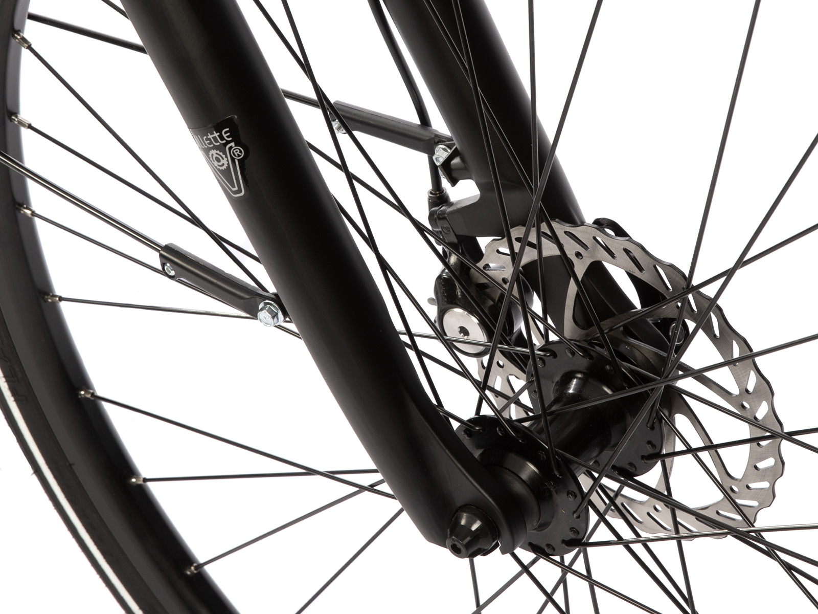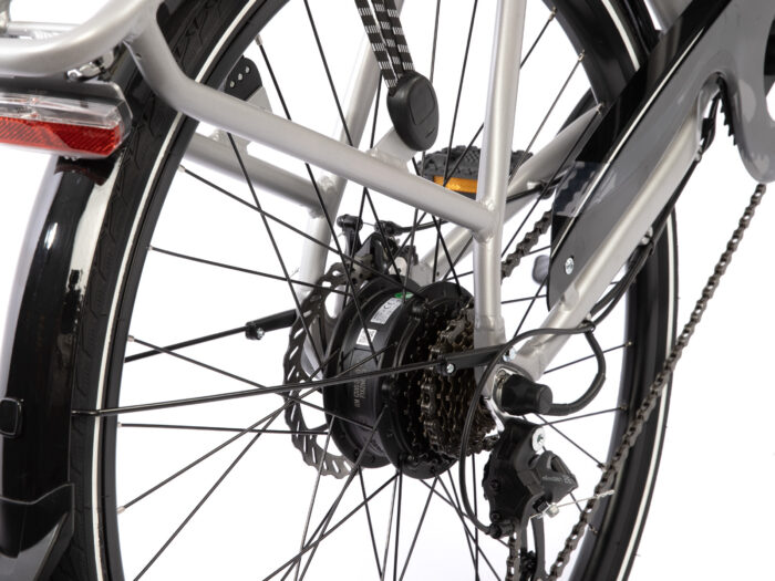 **Met de solide en moderne elektrische damesfiets Villette l’ Amant rijd je moeiteloos, dankzij de achterwielmotor en de 7 versnellingen derailleur.** Met de trapondersteuning ingeschakeld fiets je met minimale inspanning tegen de wind in, een heuveltje op of met een behoorlijke last op de stevige bagagedrager. Je kunt een snelheid van 25 km/u bereiken met ondersteuning. Gelukkig zijn de schijfremmen in het voor- en achterwiel hier op berekend. In geval van nood sta je zo weer stil. De 13 Ah accu is opgenomen in het solide aluminium frame en omdat de Bafang achterwielmotor door de cassette met 7 tandwielen deels aan het oog wordt onttrokken is het niet direct duidelijk dat deze fraaie fiets voorzien is van elektrische trapondersteuning. Totdat je andere weggebruikers fluitend voorbijfietst natuurlijk. **Heerlijk toeren** Kies een van de 7 versnellingen met de draaigreep aan het stuur, bepaal de trapondersteuningsstand op het LCD en geniet van je fietstocht. De geveerde voorvork en het comfortabele zadel strijken elk wegdek glad. Met de Villette l’ Amant heb je een goed uitgeruste elektrische fiets in handen. Dit is een e-bike waarmee het heerlijk toeren is en die geschikt is voor ritjes naar de stad of voor woon-werk verkeer. De Villette l’ Amant heeft een framemaat van 48 cm, maar door de lange zadelpen en het verstelbare stuur kunnen velen een prettige zitpositie op de fiets instellen. De fiets is dan ook geschikt voor mensen van ca 160 tot 185 cm. **Let op! De fiets wordt zonder slot geleverd** Bepaal zelf wel type slot je nodig hebt, een ringslot, een kettingslot of allebei. Als je je fiets wil verzekeren is een ART2 slot vaak verplicht. **Service en garantie** zijn in de vertrouwde handen van FSNplus. Bij aankoop van de fiets krijg je de contactgegevens mee. FSNplus heeft een landelijk dekkend netwerk van vaste en mobiele fietsreparateurs. Er is er altijd een bij je in de buurt. Als eigenaar van de fiets ben je zelf verantwoordelijk voor het onderhoud en het controleren en vervangen van de slijtende onderdelen, zoals remblokken en banden.