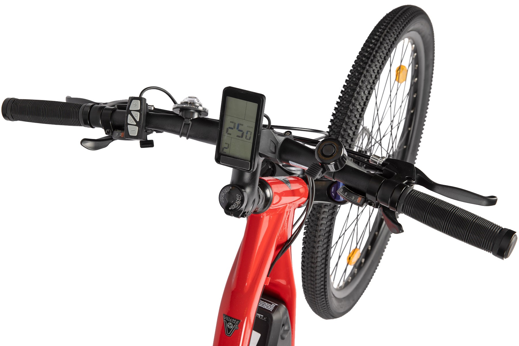 Mountainbiken is een heerlijke sport die je zo zwaar kunt maken als je zelf wilt. Wanneer je merkt dat je kracht te kort komt voor echt mooie ritten of om die ene steile helling op te kunnen rijden brengt de Villette le Sommet uitkomst! De aluminium fiets heeft een framehoogte van 47 cm en 27.5 inch wielen, zodat de fiets voor veel mannen en vrouwen geschikt is. Het verstelbare stuur en de lange zadelpen maken voor velen een goede zithouding mogelijk. Dankzij de 24 versnellingen met Rapid Fire schakelaars, de geveerde voorvork en de mechanische schijfremmen kun je op deze mountainbike prima uit de voeten op allerlei soorten terrein, dankzij de batterijverlichting ook in de schemering en in de stad. En wordt het allemaal net iets te zwaar of te ver, dan schakel je eenvoudig de trapondersteuning in op het LCD display, waarna de 13 Ah accu zijn stroom naar de MXUS achterwielmotor voert. De 34 Nm trekkracht geeft je net dat beetje extra dat je zo af en toe nodig hebt. En wanneer je deze fiets inzet voor dagelijks gebruik is het natuurlijk ook gewoon een fijne mogelijkheid om zonder al te veel inspanning fris en fruitig op je werk of op school aan te komen. Voor kampeerders met een voorliefde voor de wildere natuur is een elektrische mountainbike een uitstekende keuze. De fietsen kunnen op elke fietsdrager mee worden genomen, de wielen zijn immers niet groter dan een gewone fiets. Ook is deze e-bike prima te gebruiken zonder de motor in te schakelen, waardoor sportievelingen helemaal aan hun trekken komen en er dagenlange tochten mee kunnen maken. Als de inspanning te groot dreigt te worden, of als je gewoon zonder veel inspanning een eindje wilt rijden, schakel je de trapondersteuning in. Hoe dan ook, met een MTB kun je in elk terrein uit de voeten. Deze fiets is wat dat aangaat een stuk bruikbaarder voor echte avonturiers dan een gewone e-bike of een vouwfiets. Villette fietsen: rijden zonder zorgen. Uw Villette e-bike is met veel zorg door vakmensen samengesteld. De gebruikte onderdelen zijn van onberispelijke kwaliteit om een lang en zorgeloos gebruik te kunnen garanderen. U kunt op uw Villette fiets vertrouwen. Vanzelfsprekend dient u de fiets af en toe na te (laten) kijken op slijtage van de slijtende delen, zoals banden, remblokjes, tandwielen en ketting. Op zijn tijd een grondige schoonmaakbeurt (maar niet met een hogedrukspuit!) zal de levensduur verlengen, evenals het om de twee of drie maanden smeren van de draaiende delen. Dit kunt u zelf doen, of bij een fietsenmaker laten uitvoeren. Een fijne fietstocht. Zorg ervoor dat de accu voldoende is opgeladen voor de tocht die u in gedachten heeft. Zijn de banden goed opgepompt? Hou er rekening mee dat de door de fabrikant opgegeven actieradius is berekend met de meest gunstige omstandigheden: gering gewicht van de berijder, prachtig weer, lichtste ondersteuningsstand en volop meetrappen van de berijder. In de praktijk zal de genoemde actieradius vrijwel nooit gehaald worden. Slecht wegdek, te lage bandenspanning, tegenwind en het kiezen van een hogere ondersteuning zijn allemaal factoren die ervoor zorgen dat de actieradius afneemt. Mocht de accu leeg zijn voordat u aan het eind van uw tocht bent, weet dan dat de fiets ook prima zonder ondersteuning fietst, en dat de weerstand van de motor nihil is wanneer deze is uitgeschakeld. Klaar voor vertrek? Niets staat een mooie tocht in de weg. Als u onderweg even wilt stoppen voor een bezoek aan een winkel of horecagelegenheid, geen probleem! Standaard uitklappen en de fiets op slot zetten (de fiets wordt zonder slot geleverd, wij raden u aan een ART gekeurd slot aan te schaffen), neem eventueel de accu uit als dat een zekerder gevoel geeft, en neem die rust. Vaak kunt u bij horecagelegenheden de accu bijladen. Neem dus voor de zekerheid op langere ritten ook de oplader mee. De accu, onderhoud en opslag. De accu van uw Villette e-bike is een belangrijk onderdeel van het elektrische systeem. Bij aankoop zal de accu meestal half vol zijn. U dient de accu voor het eerste gebruik volledig op te laden. Rij de accu (in een of meerdere tochtjes, dat maakt niet uit) zo ver leeg dat de accu indicatie op het display gaat knipperen. Laad vervolgens de accu weer volledig op. Herhaal deze cyclus minstens 4 keer. Op deze manier zal de accu optimaal geactiveerd worden en de volledige accucapaciteit gebruikt kunnen worden. Na deze 4 cycli van helemaal opladen en vrijwel helemaal leegrijden kunt u de accu ook tussentijds gaan bijladen, wanneer dat nodig zou zijn. Dat heeft dan geen invloed meer op de levensduur.